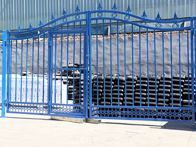 主要做法還是一方管做大門框架,然后使用鐵板作底,把整個門做成實心的,然后在鐵板上,框架里使用鐵藝配件拼接鑲嵌。這種實心門的性能就傾向于實用性,安全性,但是材料使用量比較多,在美觀方面也不是很突出,比較適合做小尺寸的門,比如私家小院門。